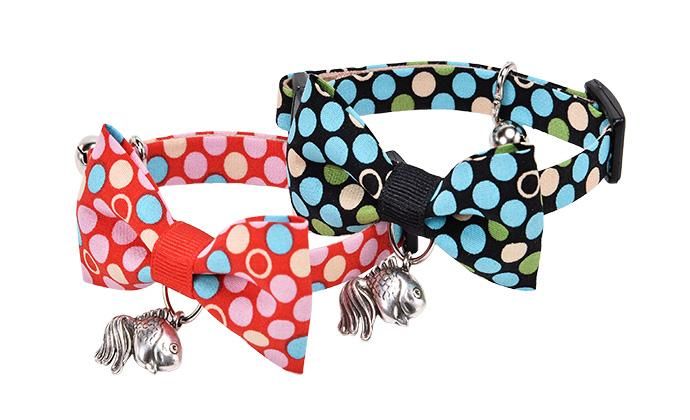 カラフルな水玉模様が特徴の 蝶ネクタイ付き猫首輪。