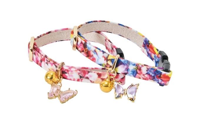 鮮やかな模様のベルトと、透明感のあるバタフライチャームでラグジュアリーな雰囲気の猫首輪。