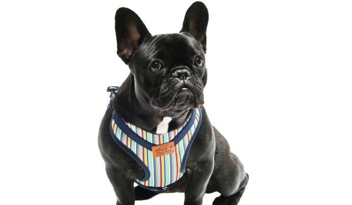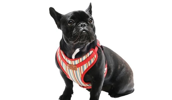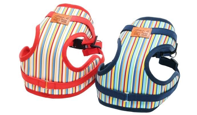 マルチストライプ柄の犬用ハーネス。