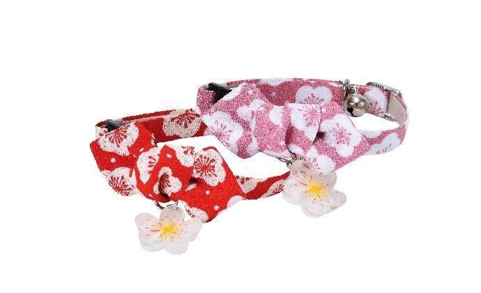 梅柄のちりめん生地が映えるようにリボンをあしらった猫用首輪です。