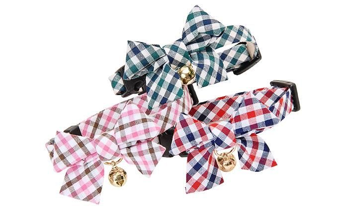 ピンチェック柄の蝶ネクタイで ちょっとおすましな猫首輪です。